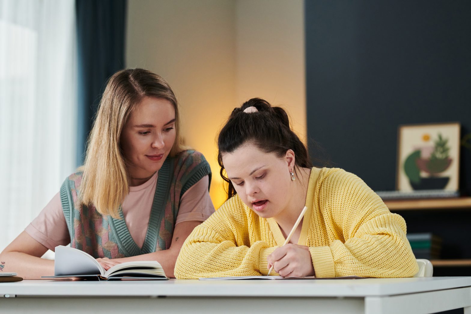 Young Caucasian teacher sitting at table next to female student with Down syndrome helping with subject during individual class
